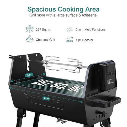 【2-in-1 Charcoal Grill & Motorized Rotisserie】Switch effortlessly between traditional BBQ grilling and a powered rotisserie spit for whole chickens, roasts, and more