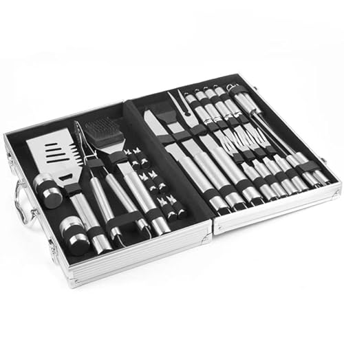 The set includes a variety of tools such as tongs, skewers, a spatula, a fork, a brush, and more. Each tool is constructed from high-quality stainless steel, making them durable and resistant to rust and corrosion. The handles are designed with a comfortable grip, so you can handle your food with precision and ease.